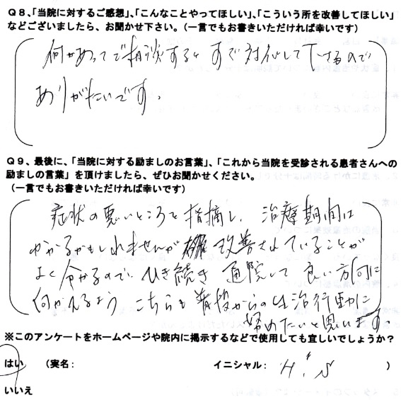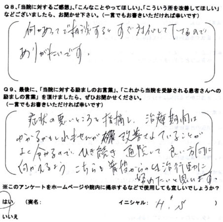 H.S様 何かあって相談するとすぐ対応してくださるのでありがたいです。 症状の悪い所を指摘し、治療期間はかかるかもしれませんが、改善されていることがよく分かるので、引き続き通院して良い方向に向かえるよう、こちらも普段からの生活行動に努めたいと思います。